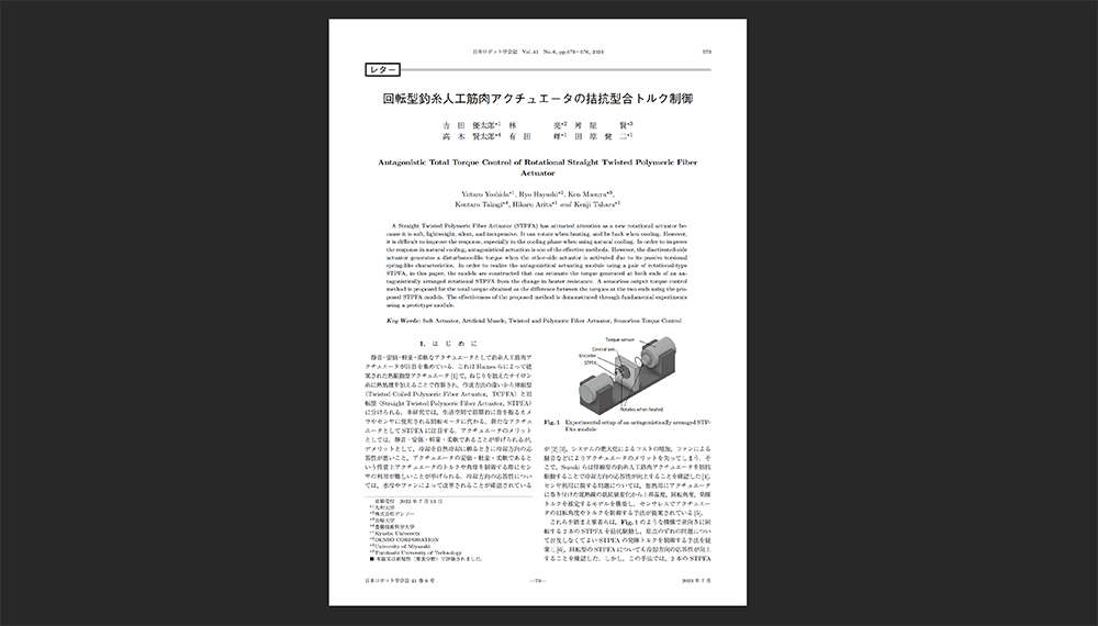 Prof. Hikaru Arita’s paper on avoidance motion of manipulators using areal distributed proximity sensors has been accepted and published in Advanced Robotics! The paper describes a manipulator’s avoidance maneuver against an obstacle using a flexible areal distributed proximity sensor sheet attached to the entire manipulator link. You can get the article from the Website.